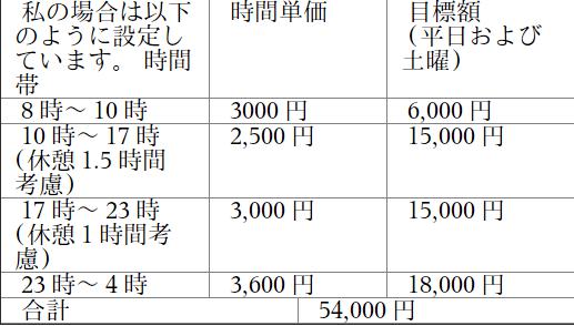 に大切です。目標を設定しているのとしていないのとでは、売上が全く違ってきます。勿論、その日の状況によっては、目標金額に届かないこともあるでしょう。しかし、なりゆきで仕事をするよりは、ずっとよい結果が生まれます。会社によって給与システムが若干異なりますが、月の売上が70万以上あれば、歩合は65%くらいでしょう。ですから月収45万円を稼ぐためには、毎日の平均売上が5万4千円で13日出勤すればOKです。もし休日出勤をして14日出勤するのであれば、平均売上はちょうど5万円でOKです。一日の売上目標を決めたら、それを絶対に達成するという気持ちで仕事をしましょう。目標金額は一時間毎にキッチリと設定するのもよい手法です。